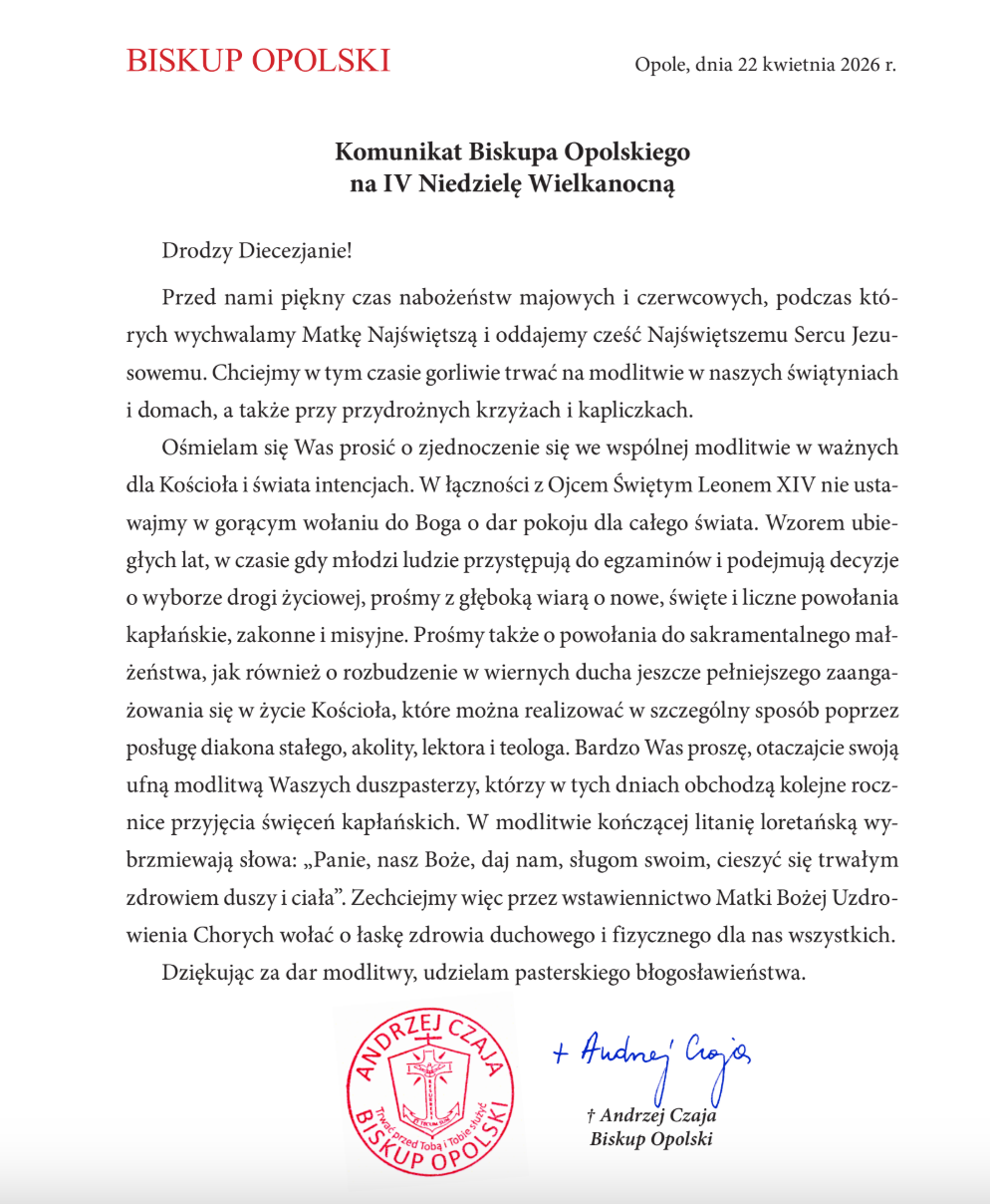 MSZE ŚWIĘTEw niedziele i uroczystości:07:00, 08:30, 10:00, 11:30 i 18:00Spowiedź św. podczas Mszy św. MSZE ŚWIĘTEw dni powszednie:07:00 i 18:00Spowiedź św. pół godz. przed Mszą św. Duszpasterze Parafii Kancelaria Parafialna Zmarli Parafianie Transmisja z kościoła na żywo Aktualności XIII Jarmark Cysterski w Jemielnicy – 1 maja 2026 Load More Komunikat Biskupa Opolskiego na IV Niedzielę Wielkanocną Load More Trasa Wybrani – Wielkanocne spotkania młodych – w naszej Parafii Load More 82. Tydzień Miłosierdzia 12-18 kwietnia 2026 Load More Więcej aktualności Intencje mszalne i Ogłoszenia duszpasterskie INTENCJE MSZALNE 27.04 – 03.05.2026 Load More OGŁOSZENIA DUSZPASTERSKIE 26.04 – 03.05.2026 Load More Klendarium wydarzeń w Parafii Wspólnoty i instytucje Ministranci Dzieci Maryi Skauci Króla Żywy Różaniec Dom Miłosierdiza Siostry Boromeuszki Biblioteka Parafialna Sklepik Caritas Apostolat Maryjny Fotogaleria Święte Triduum Paschalne 2026 Load More Otwarcie Jubileuszu 325-lecia Konsekracji Kościoła Parafialnego Load More PASTERKA 2025 Load More Odpust Parafialny ku czci św. Mikołaja i św. Franciszka Ksawerego – 07.12.2025 Load More