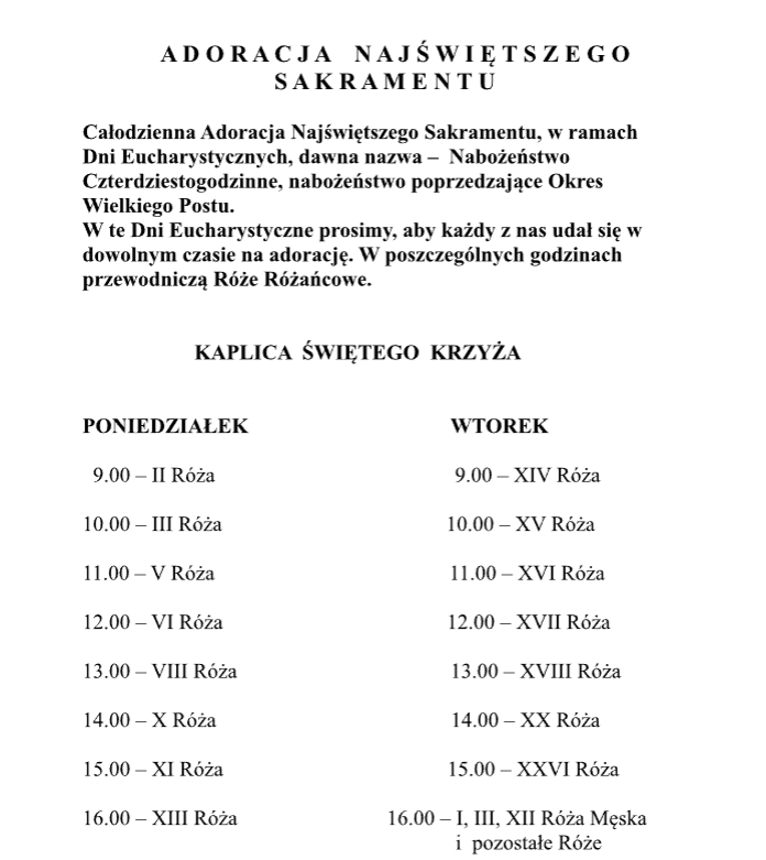 Zgodnie ze zwyczajem: w niedzielę, poniedziałek i wtorek poprzedzającymi Środę Popielcową – odbywa się w kościołach całodzienna Adoracja Najświętszego Sakramentu, w ramach Dni Eucharystycznych, dawna nazwa – Nabożeństwo Czterdziestogodzinne, czyli nabożeństwo poprzedzające Okres Wielkiego Postu. W naszej parafii adoracja w Kaplicy św. Krzyża od godz. 09:00 do 17:00. W te Dni Eucharystyczne prosimy, aby każdy z nas udał się w dowolnym czasie na adorację. W poszczególnych godzinach przewodniczą Róże: